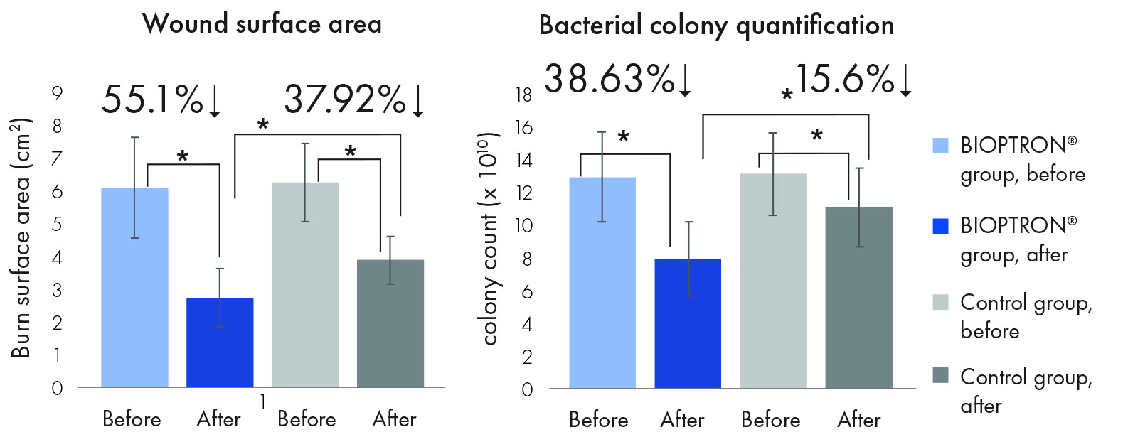 Abbildung links: Die Verbrennungsfläche wurde in nur einem Monat von 9,5 cm2 auf 4,2 cm2 reduziert, was einer Abnahme der Wunde um 55,1% entspricht (im Vergleich zu weniger als 38% in der Kontrollgruppe (mit LLLT behandelt)). Abbildung rechts: Die Bakterienkoloniezahl sank signifikant mehr als doppelt so stark wie in der Kontrollgruppe (Abnahme in der BIOPTRON®-Gruppe um 38,63% im Vergleich zu 15,6% in der Kontrollgruppe).