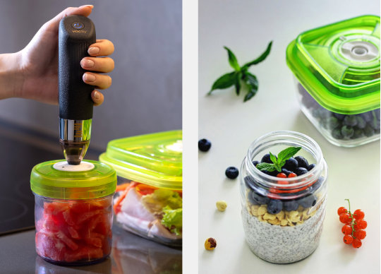 VacSy® ist ein weltweit patentiertes Lebensmittelvakuumsystem, mit dem ein Vakuum in speziellen Glas- und Plastikbehältern oder luftdichten Beuteln erzeugt werden kann. Die Vakuumumgebung entzieht Bakterien und Schimmelpilzen den zum Überleben erforderlichen Sauerstoff und behält den Geschmack und die gesunden Eigenschaften des Lebensmittels bei! Lebensmittel bleiben bis zu 5-mal länger frisch und gesund als unter normalen Kühlschrankbedingungen.